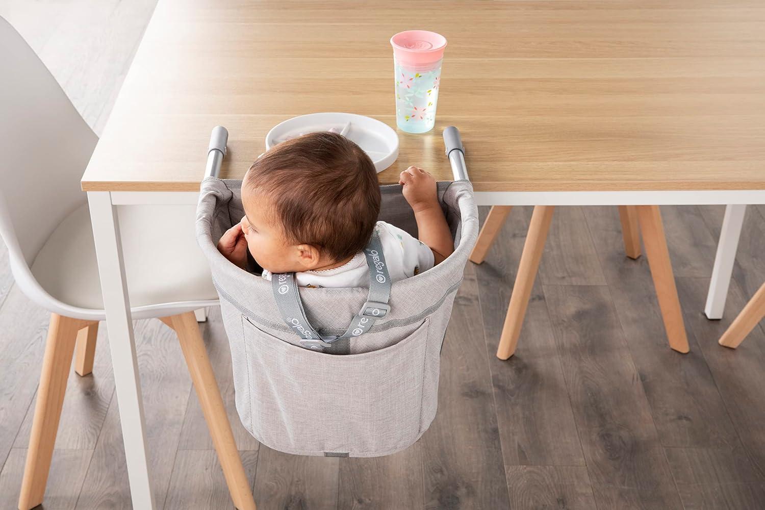 SAFE AND SECURE: Sturdy all metal frame, includes a 5-point adjustable harness and double locking system to ensure a safe and secure attachment to tables. Safe for children up to 37 lbs. Passes all safety standards set by ASTM and JPMA.