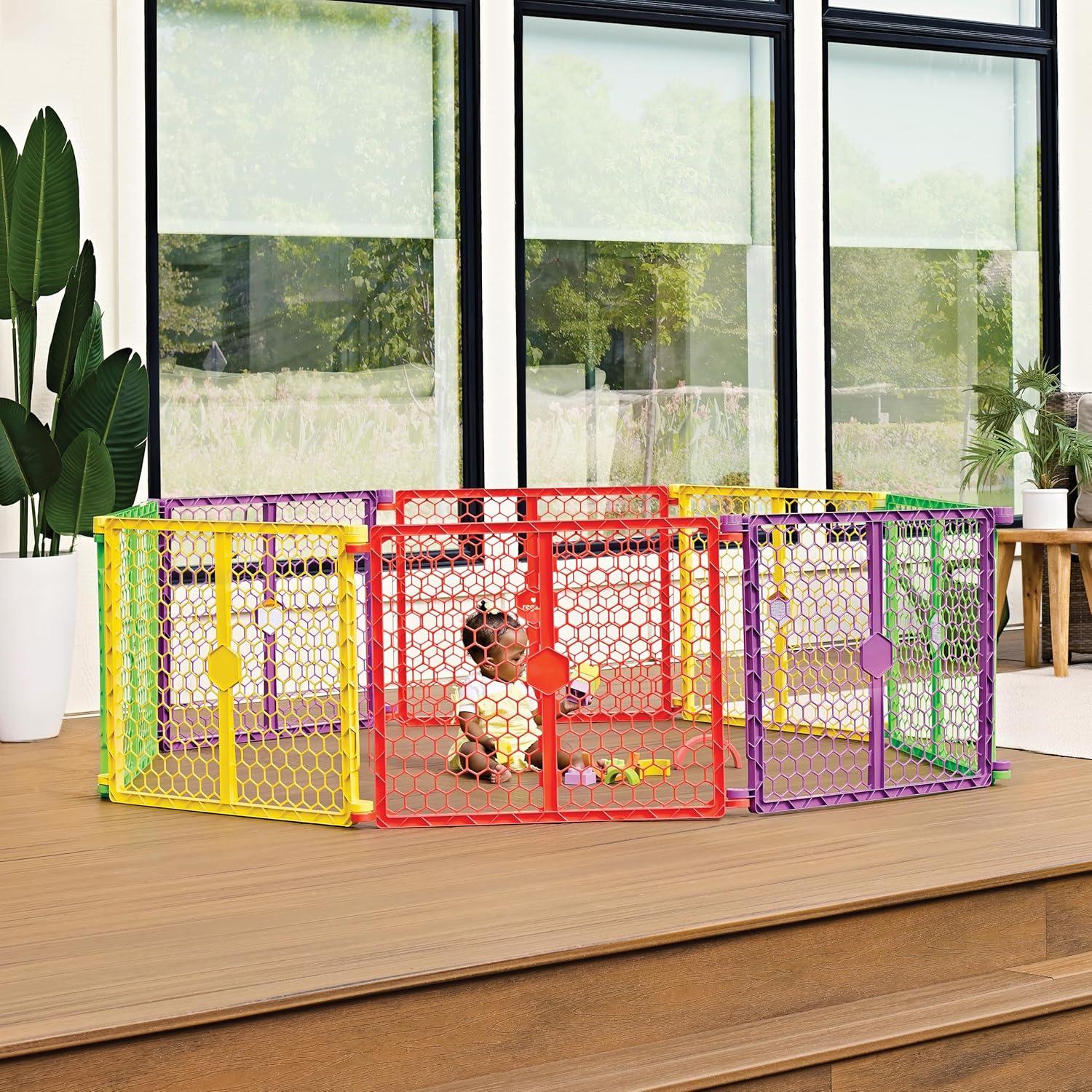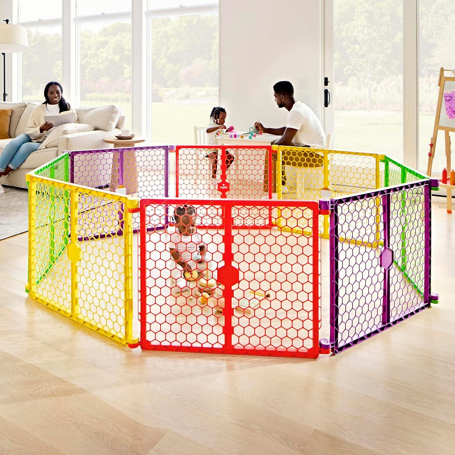 The Regalo 260-Inch Super Wide Baby Gate and Play Yard is the ultimate 2-in-1 safety solution for busy families. Designed for today’s open-concept homes, this extra-wide gate extends up to 260 inches, giving you the flexibility to safely block off large areas, wide openings, angled spaces, or irregular layouts where traditional gates do not fit. Using the included hardware, quickly mount the gate securely to walls or banisters for reliable protection around fireplaces, kitchens, stairs, or other high-traffic areas. Convert it at any time into a freestanding play yard, creating a spacious, enclosed play space your child will love. Constructed from lightweight, durable plastic panels, the gate is easy to clean and suitable for both indoor and outdoor use. The fun red, white, and blue colorway adds a patriotic touch to playrooms, backyards, and holiday events. When you’re done, the entire system folds flat, making storage and portability effortless. Ideal for babies and toddlers 6–24 months, this versatile gate grows with your family and adapts to your home—offering safety, convenience, and flexibility in one complete package.